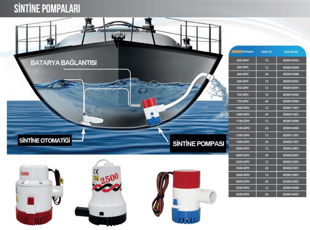 Elektrikli Sintine Pompası: 12V sintine pompası ve 24V sintine pompası gibi farklı voltaj seçenekleriyle çalışır. Otomatik veya manuel olarak kullanılabilir.