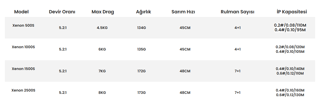 Eğer ultra hafif yemler, ince kamışlar ve ince misinalarla avlanıyorsanız, Xenon’un bu amaç için optimize edilen hat yerleşimi (line lay) ve yavaş sarım mimarisi fark yaratır. Çok noktalı sızdırmazlık detayları su sıçramalarına karşı korunmaya yardımcı olur; böylece tuzlu ve tatlı su koşullarında istikrarlı performans sunar. Hassas sarım, ince hatlarda düzensiz katmanlaşmayı azaltmayı amaçlar; atışta temiz hat çıkışı ise hafif yemlerle dahi tatmin edici bir menzil sağlar ve düğüm oluşmasının büyük ölçüde önüne geçer. Xenon, yalın ama iddialı bir endüstriyel çizgiyi benimser: koyu gövde tonları, metalik vurgular ve işlevi öne çıkaran formlar. Erişilebilir orta segment fiyat noktasında konumlanan seri; LRF, Aji ve hafif kıyı avcılığını benimseyen geniş kullanıcı grubu için kullanıma sunulmuştur.
